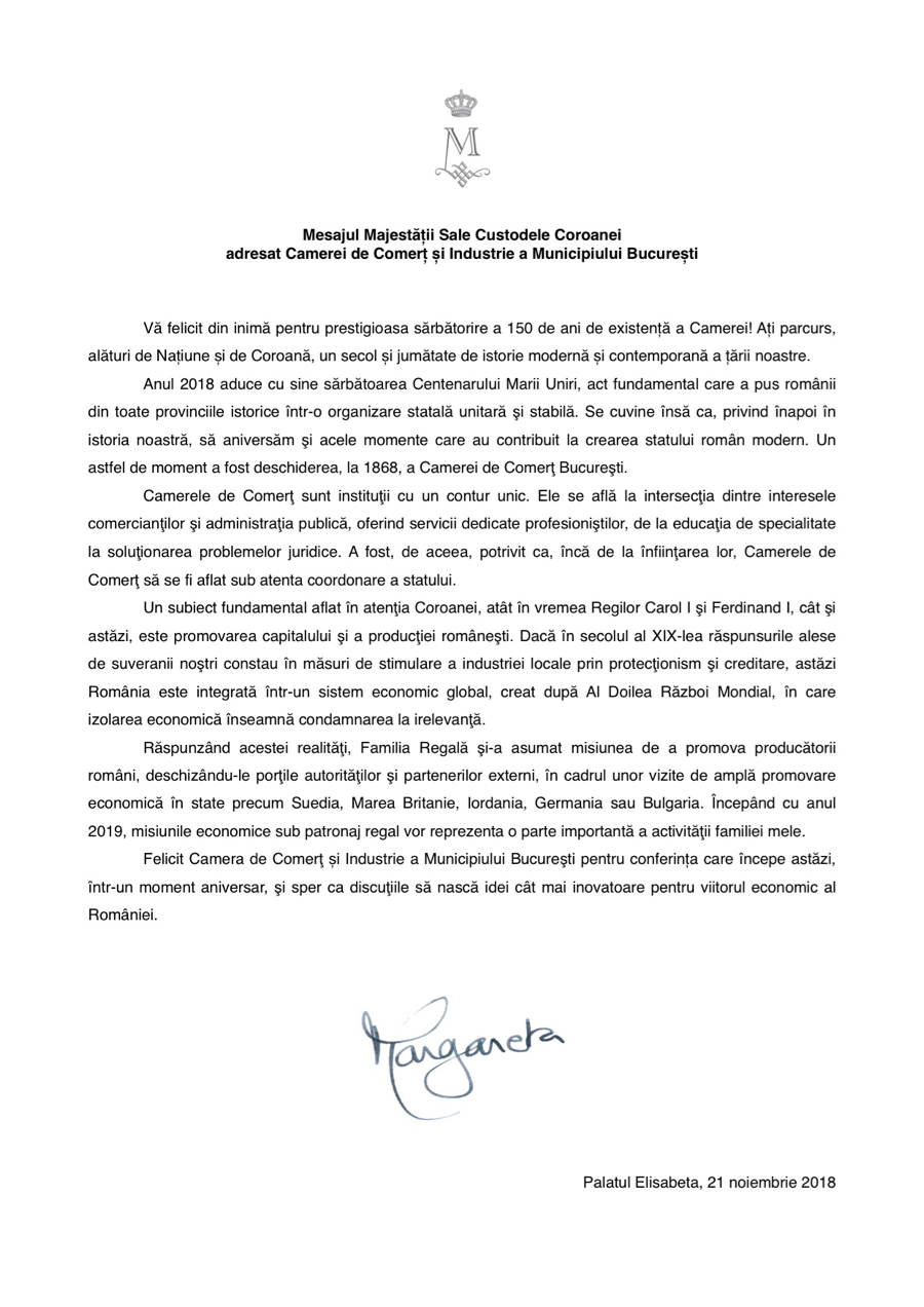 Cu ocazia împlinirii, anul acesta, a un secol și jumătate de existență a Camerei de Comerț și Industrie a Municipiului București și în deschiderea Conferinței “România 2030”, Majestatea Sa Margareta, Custodele Coroanei, a trimis organizației naționale un mesaj.