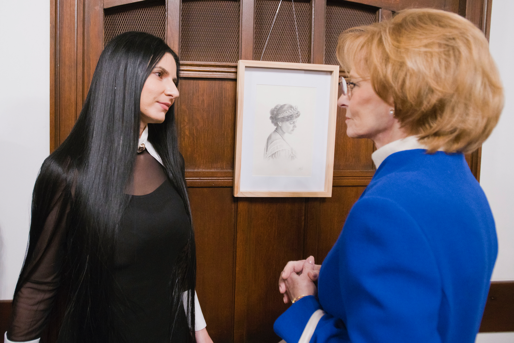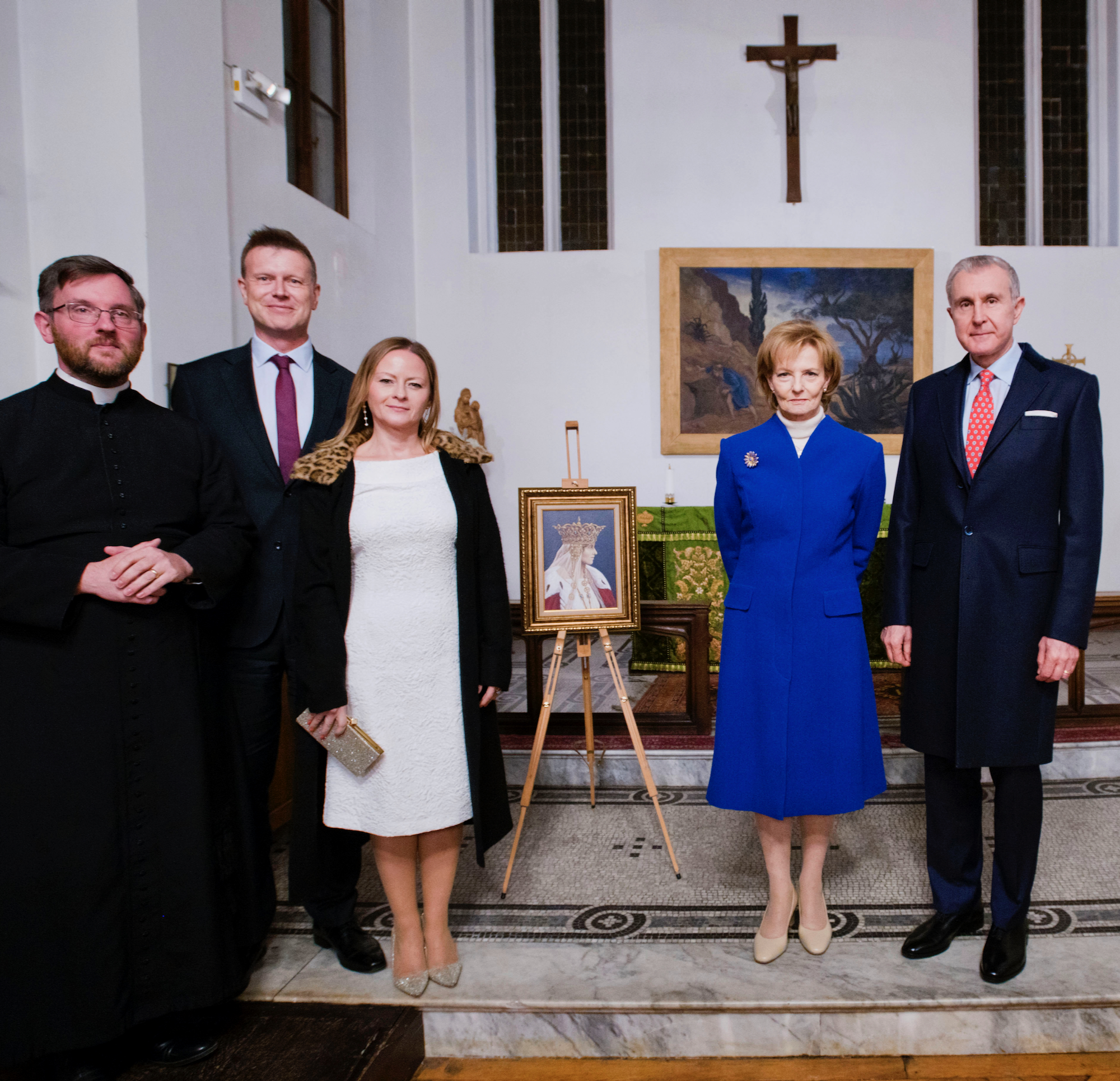 Majestatea Sa și Principele Radu au admirat lucrări de artă plastică dedicate Reginei Maria, expuse pentru această ocazie în incinta bisericii și au stat de vorbă cu personalitățile românești și britanice prezente la aniversare.