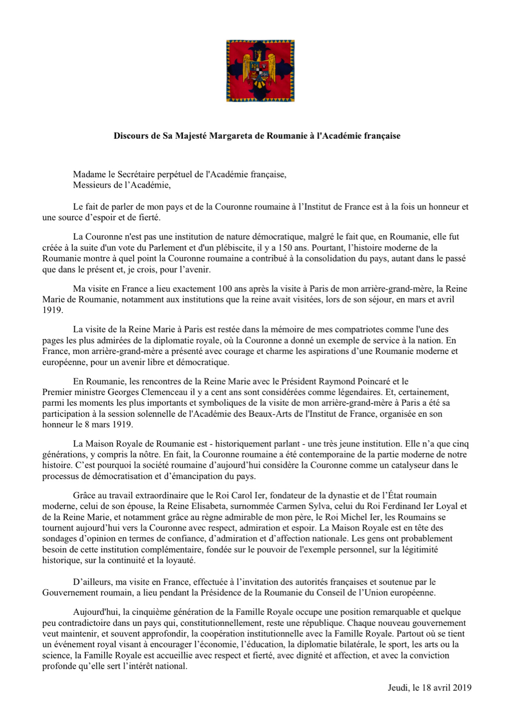 Discours de Sa Majeste Margareta de Roumanie a l’Academie francaise