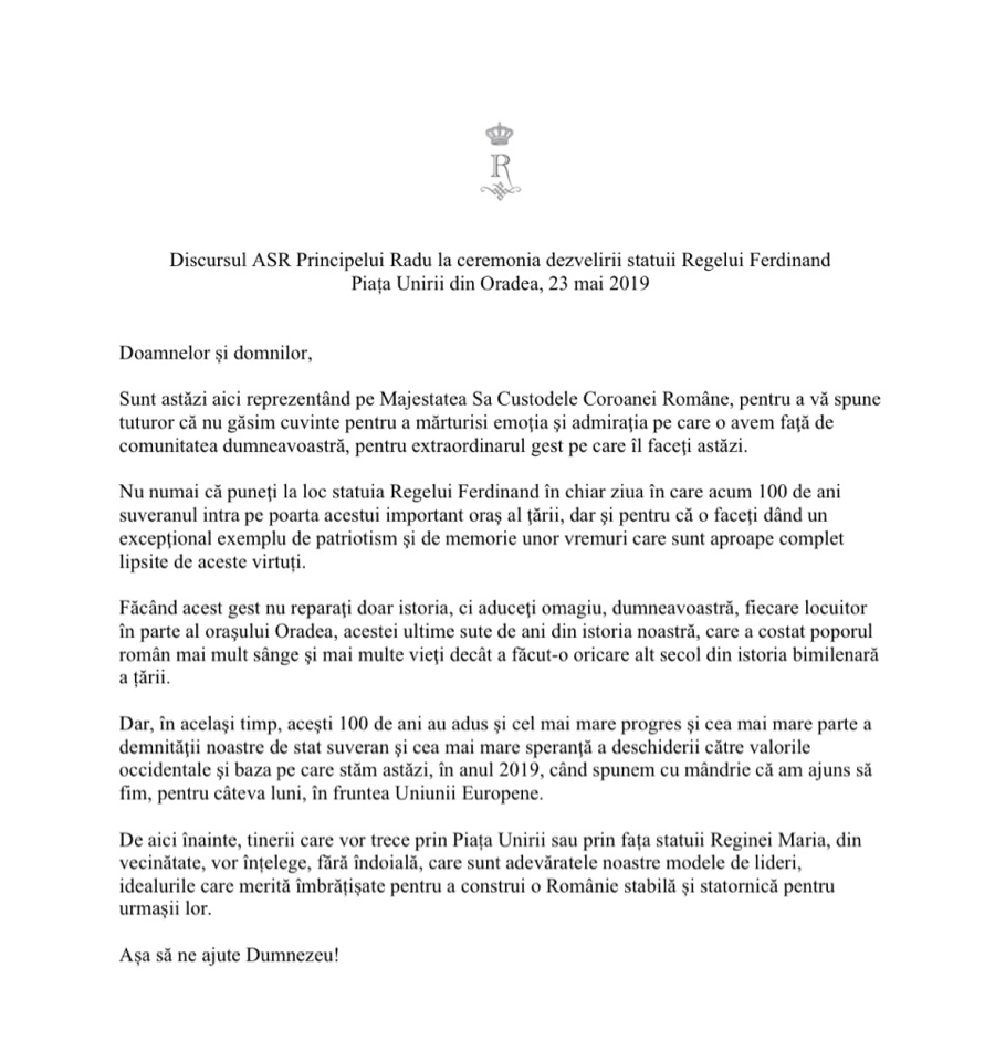 Discursul ASR Principelui Radu la ceremonia dezvelirii statuii Regelui Ferdinand