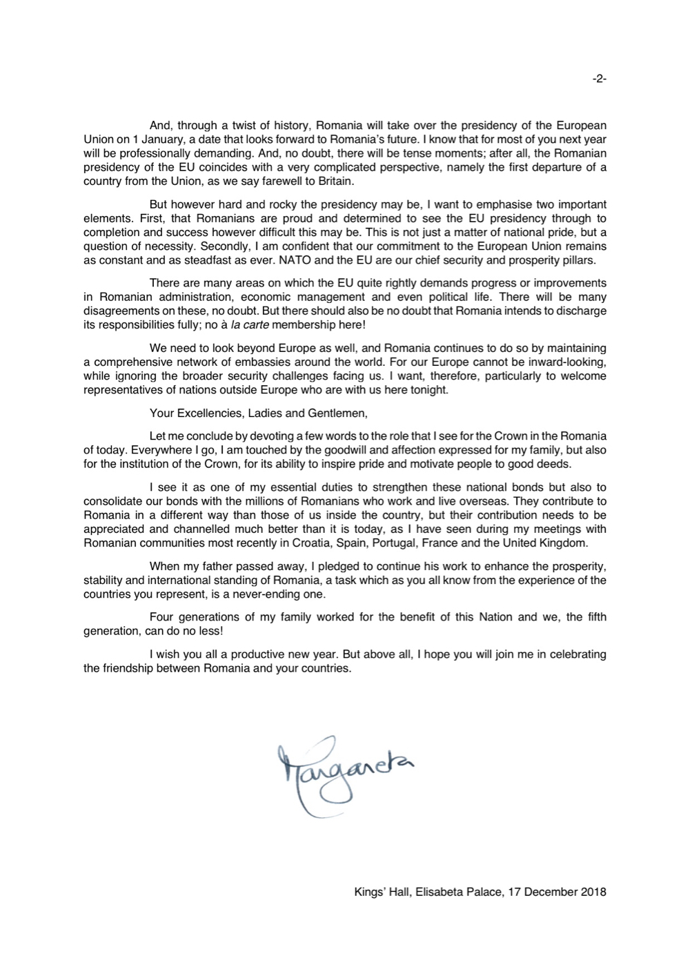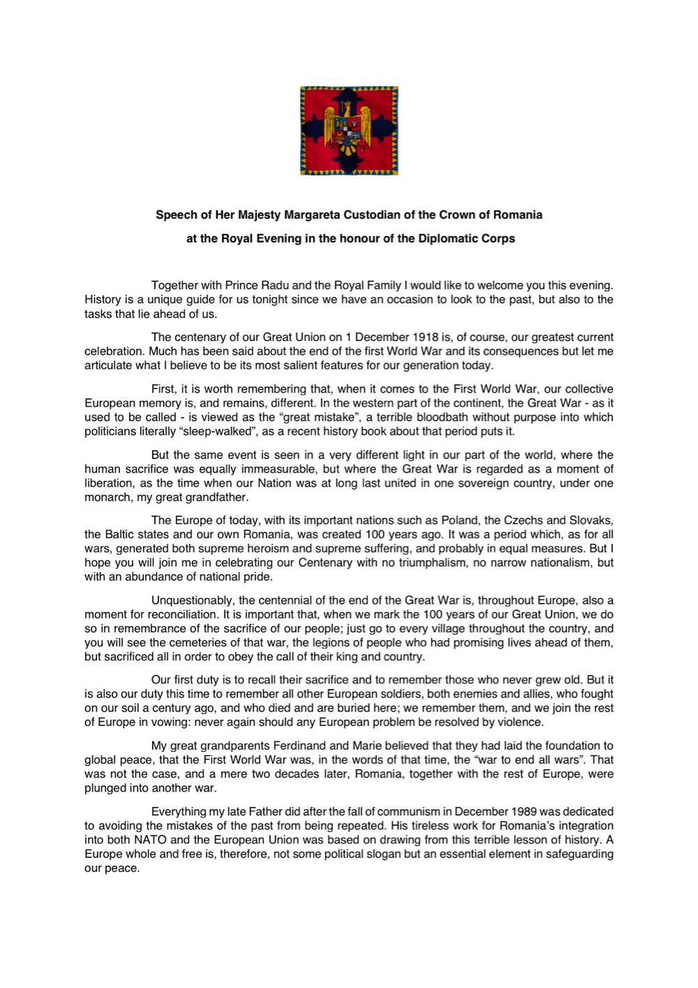 Discursul Majestății Sale la seara regală în onoarea Corpului Diplomatic