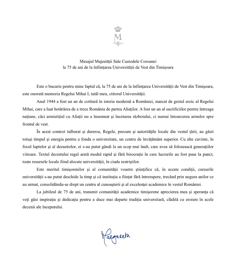 Mesajul Majestății Sale Custodele Coroanei a fost adresat studenților și profesorilor Universității de Vest din Timișoara, cu ocazia împlinirii a 75 de ani de la fondarea universității prin decret regal, semnat de Regele Mihai I. Mesajul a fost citit în deschiderea sesiunii solemne a universității din ziua de 17 mai 2019.