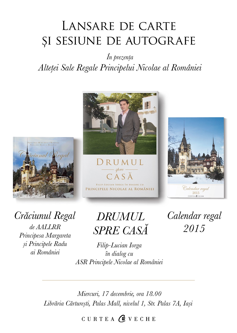 Principele Nicolae va lua parte miercuri, 17 decembrie 2014, în municipiul Iași, la evenimentul de lansare a volumelor “Drumul spre casă. Filip-Lucian Iorga în dialog cu Principele Nicolae al României”, “Crăciunul Regal” de Principesa Margareta și Principele Radu și a Calendarului Regal dedicat anului care urmează, apărute la Curtea Veche Publishing.