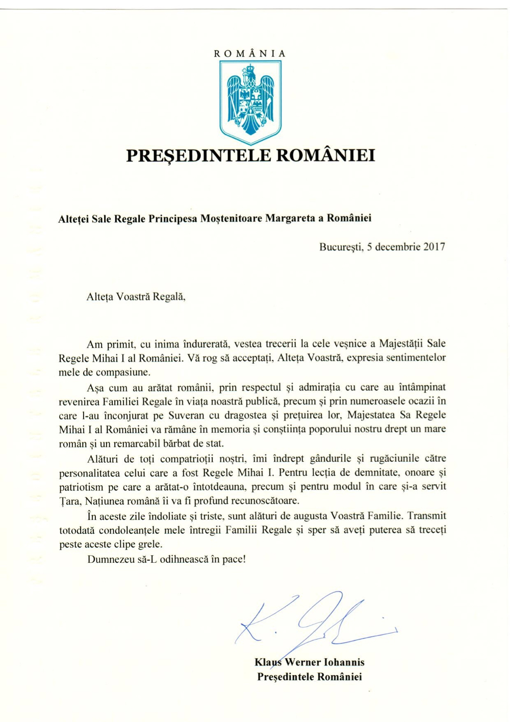 Scrisoarea Excelenței Sale Președintelui României